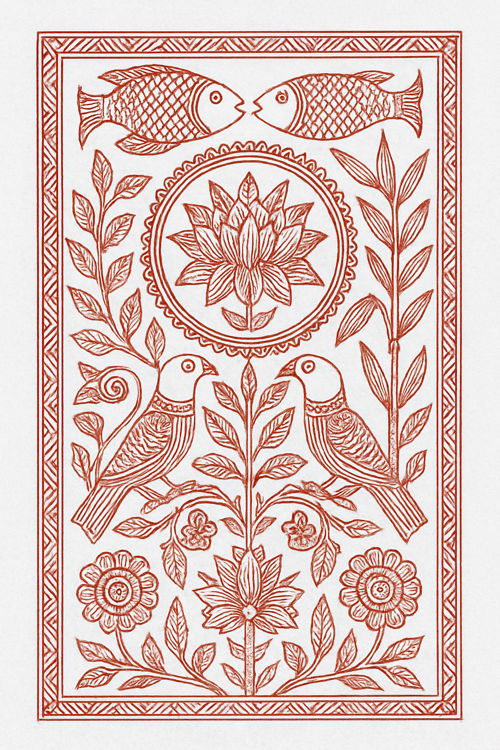 Minimalist art using red & black – known for rituals, animals & social tales. From the Kayasthas.